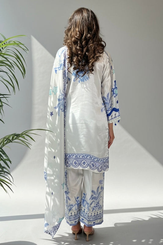 Hania White Blue Printed Satin Silk 3 Piece Suit