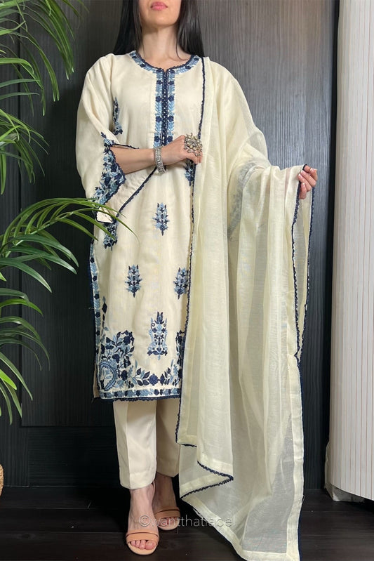Tia Ivory Blue Embroidered Khadi Net Suit