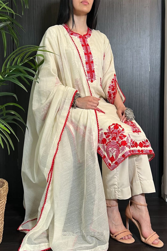 Kirrum Ivory Red Pink Embroidered Khadi Net Suit