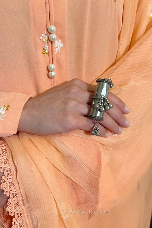 Mahek Silver Oxidized Drum Bell Tassel Ring